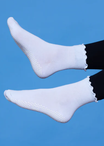 White above the ankle frill grip socks with matching grip color and logo on bottom